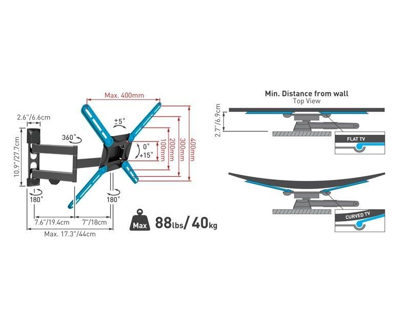 Karakteristike: | | Tip: Zidni nosač za televizor Montiranje: VESA 400mm x 100mm, VESA 400mm x 200mm, VESA 400mm x 300mm, VESA 400mm x 400mm Podržane dijagonale: Do 65 inča Nosivost: 40kg Rastojanje od zida: 69mm - 440mm Dodatne mogućnosti: Rotiranje 360 stepeni, Swivel, Tilt Uglovi pomeranja: Swivel ± 180 stepeni, Tilt 0 stepeni +15 stepeni, Vertikalna rotacija ± 5 stepeni Pakovanje: Set šrafova Stanje: Nekorišćeno Ostalo: Cable management, Mogućnost montiranja zakrivljenih televizora, Tilt lock funkcija |