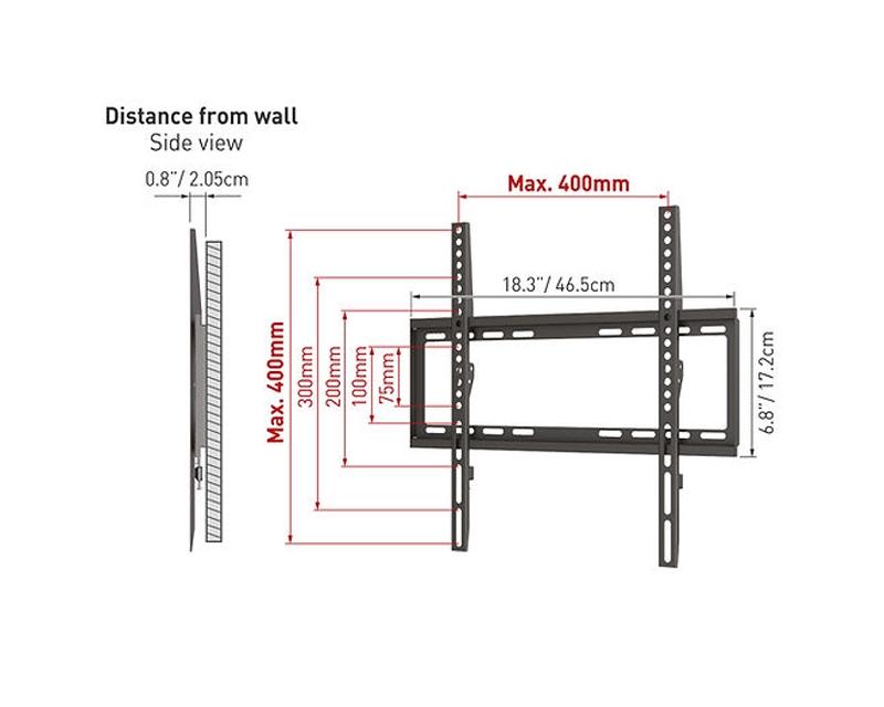 Karakteristike: | | Tip: Zidni nosač za televizor Montiranje: VESA 100mm x 100mm, VESA 100mm x 200mm, VESA 200mm x 100mm, VESA 200mm x 200mm, VESA 200mm x 300mm, VESA 300mm x 200mm, VESA 300mm x 300mm, VESA 300mm x 400mm, VESA 400mm x 200mm, VESA 400mm x 300mm, VESA 400mm x 400mm, VESA 75mm x 75mm Podržane dijagonale: 13 inča - 65 inča Nosivost: 50kg Rastojanje od zida: 20mm Pakovanje: Set šrafova |