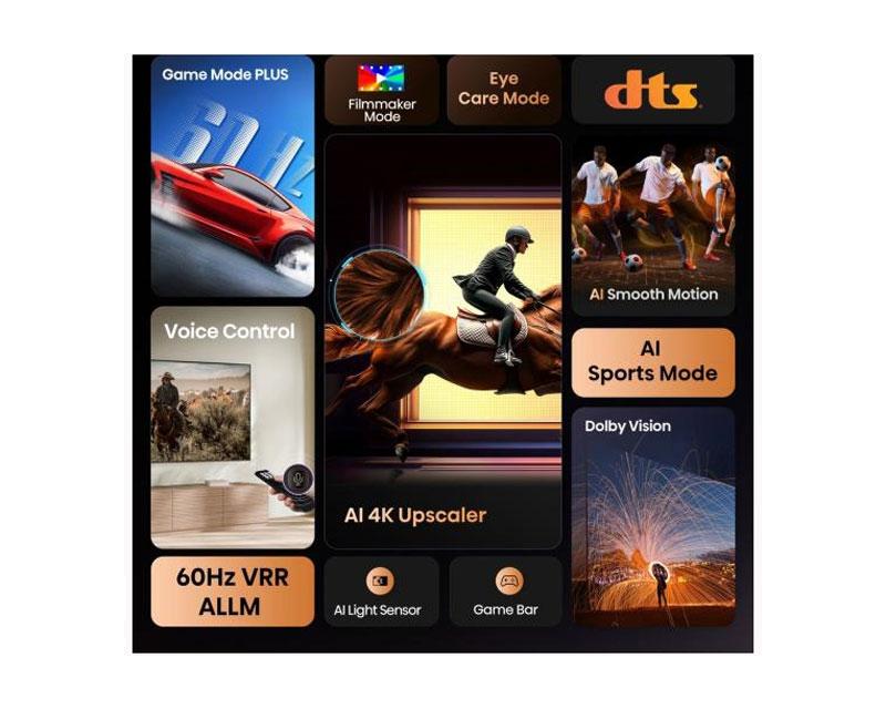 Ekran: | | Veličina ekrana: 43 inča (109cm) Rezolucija: 4K Ultra HD (3.840 x 2.160) Pozadinsko osvetljenje: LED Nativni kontrast: 5.000:1 Osvežavanje: 60Hz Odnos stranica: 16:9 Uglovi gledanja: 178 stepeni horizontalni, 178 stepeni vertikalni Ostalo: Dolby Vision, HDR, HDR10, HDR10+ decoding, HLG, Odziv 9.5ms, Smanjivanje MPEG šuma |